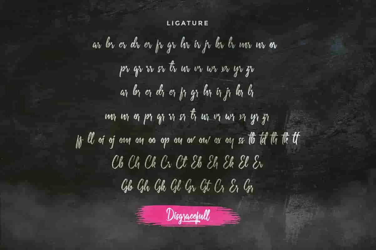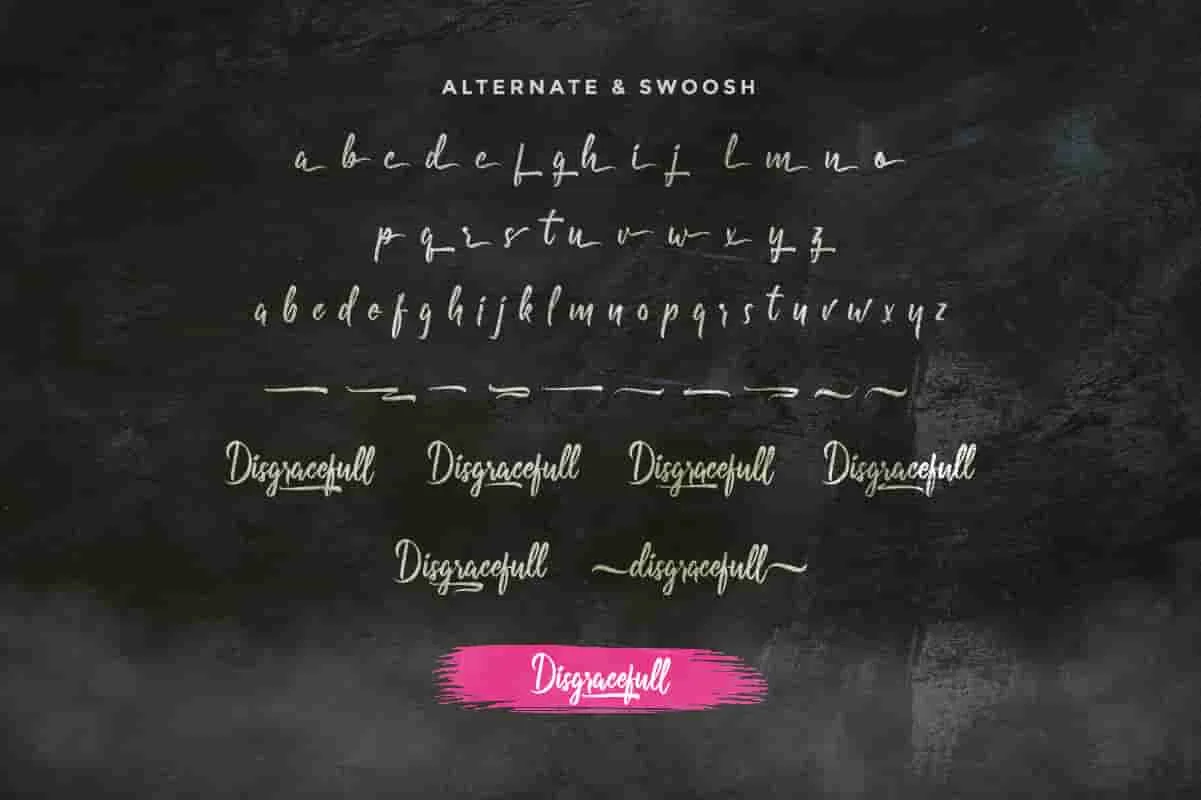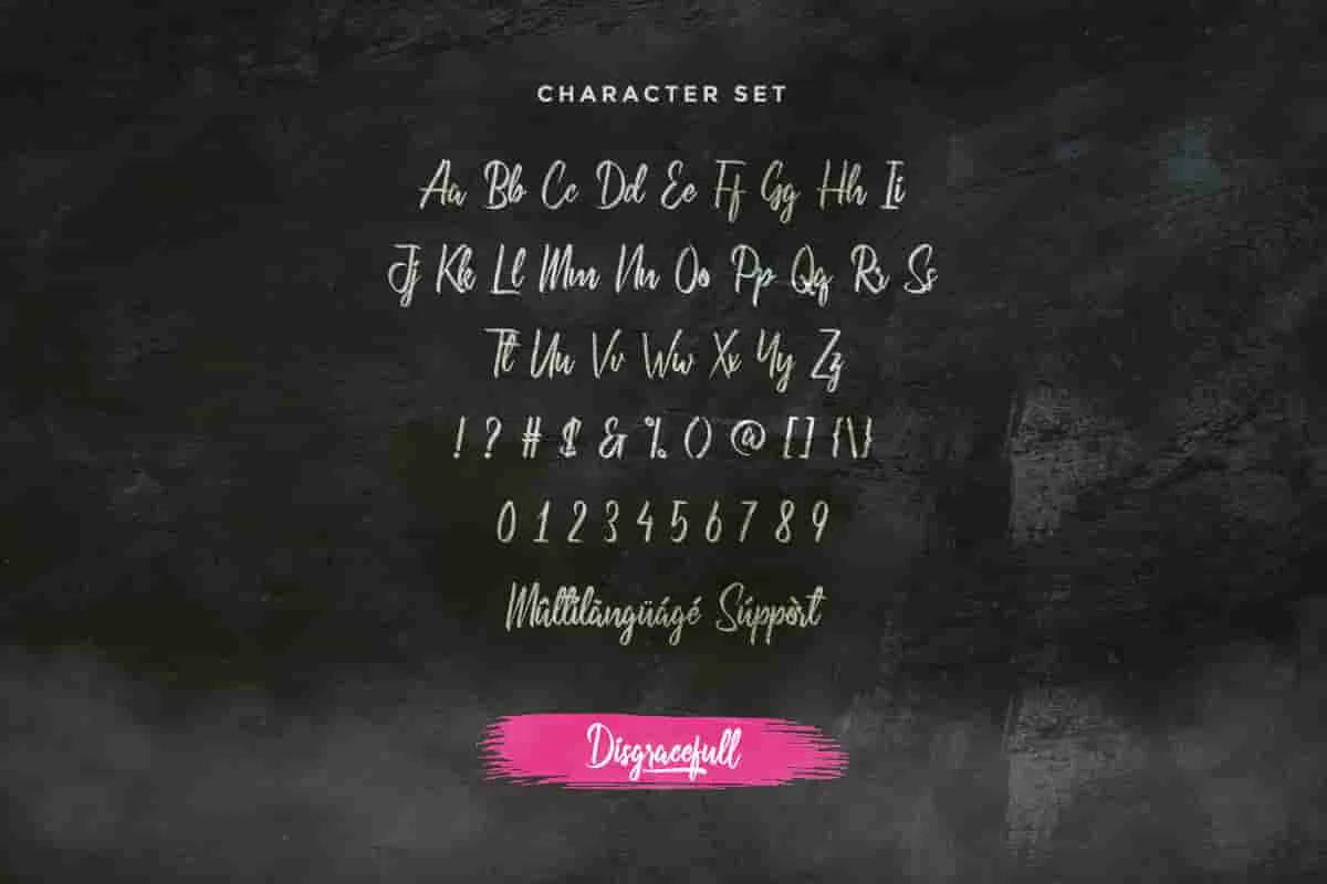Disgracefull Font is a textured brush font, designed by Rais Project. It is an elegant brush calligraphy font with exclusive style that is great for vintage, old style, wedding, Movie, Game, Magazine, Music, Video, Sports, Racing etc